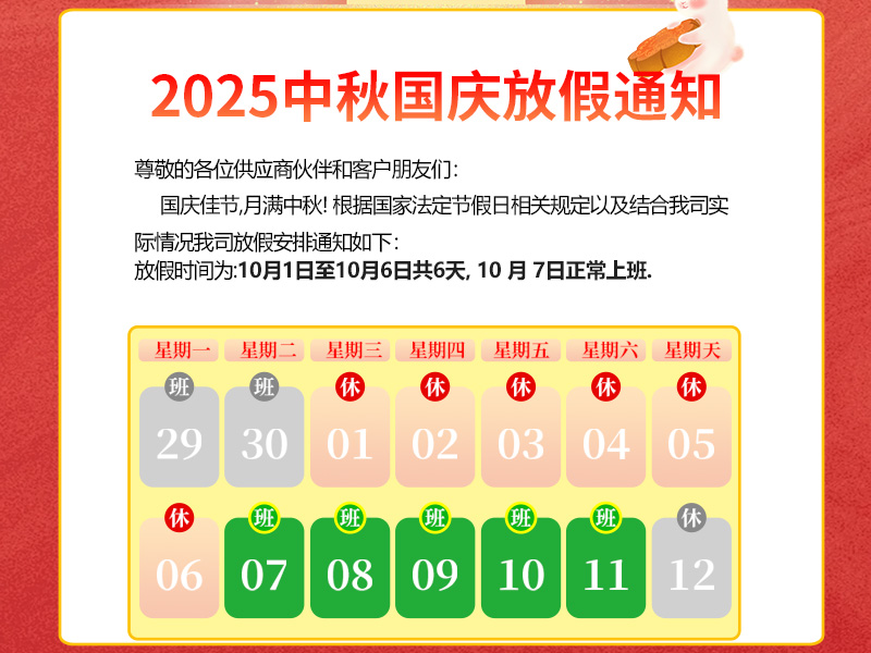 尊敬的各位供應(yīng)商伙伴和客戶朋友們:國慶佳節(jié),月滿中秋!國慶家園月圓人團(tuán)園,國慶中秋雙節(jié)共歡騰!在此預(yù)祝大家度過一個(gè)輕松、愉快的假期.根據(jù)國家法定節(jié)假日相關(guān)規(guī)定,再結(jié)合我司實(shí)際情況,現(xiàn)將2025年國慶中秋節(jié)放假安排通知如下:放假時(shí)間定為10月1日至10月6日(星期三至星期一),共計(jì)6天.2025年 10月 7日(星期二)正式上班,假日期間如有業(yè)務(wù)需求可電話咨詢業(yè)務(wù),感謝大家的理解與配合!秋高氣爽迎中